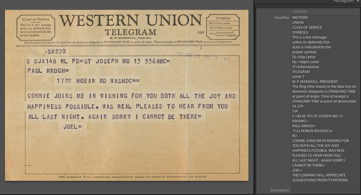 If you have a collection of scanned articles or other scanned textual documents in Lightroom, this is a great way to make visible text searchable. While Google is not the best OCR, thanks to Any Vision, it’s the easiest way I know of to add the text to image metadata automatically.